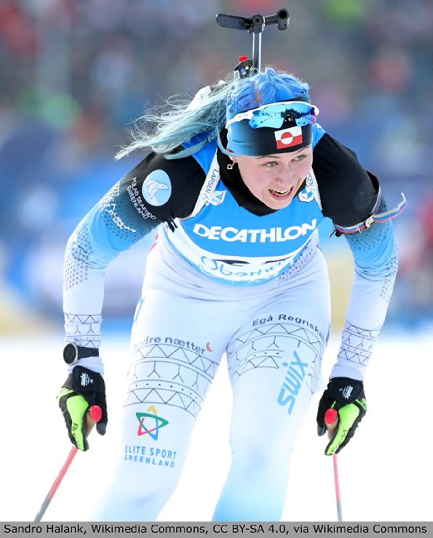 Lige nu er en af de bedste ski-skytter i verden Ukaleq Slettemark fra Grønland. Hun er altså både god til at stå på ski og skyde med gevær. Og så betyder hendes navn Ukaleq – sne-harre. Ukaleq har sagt, at hun gerne ville kunne kæmpe for Grønland til OL. Men det kan hun altså ikke, fordi Grønland ikke er sit helt eget land.