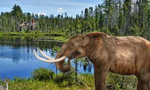 For 2 millioner år siden var Grønland dækket af skov. Dengang levede der mastodonter. Det var et stort dyr, der lignede en elefant eller en mammut. Derfor kan man finde rester af træer nogle steder i Grønland, hvor der næsten ikke kan gro planter i dag, fordi det er så koldt. På billedet kan du se, hvordan Grønland måske så ud dengang.