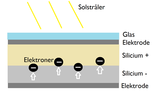 Simpelt forklaret, så består en solcelle af nogle beskyttende lag og elektriske ledere, som omgiver to forskellige typer af silicium. Det ene lag silicium har et overskud af elektroner omkring atomkernerne og det andet lag har et underskud af elektroner. Når lyset fra solen rammer solcellen, bliver der skubbet til elektronerne i silicium-lagene, som så begynder at bevæge sige mellem de to lag silicium og dermed skaber en elektrisk strøm, som opfanges af metallederne.