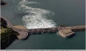 Normalt skal man bruge en strøm, der bevæger sig med mindst 2,5 meter i sekundet, for at skabe tidevandsenergi. Så hurtigt bevæger vandet sig kun ret få steder i verden. På billedet kan du se verdens første tidevandsanlæg i La Rance i Frankrig.